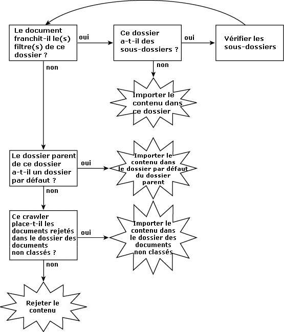 Si le crawler est configuré de manière à ne pas tenir compte des filtres des dossiers destinataires, la première étape de cet organigramme considère que le document a franchi les filtres du dossier. Cependant, seuls les filtres des dossiers destinataires ne sont pas pris en considération ; si le dossier destinataire comporte des sous-dossiers avec filtres, ceux-ci seront appliqués.